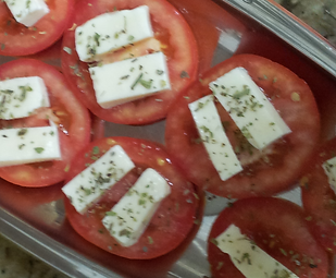 Corte o queijo branco em pedaços pequenos e coloque em cima do tomate.